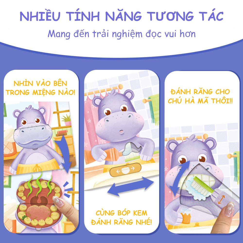 Bé thấy bạn hà mã đánh răng, bạn gấu dọn đồ chơi, bạn cừu đi ngủ… và tự nhiên muốn làm theo.
