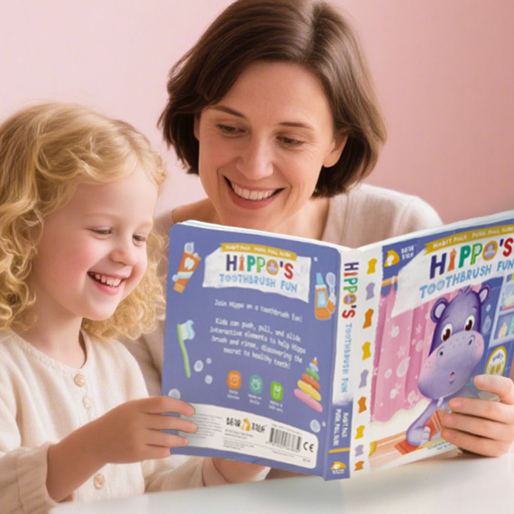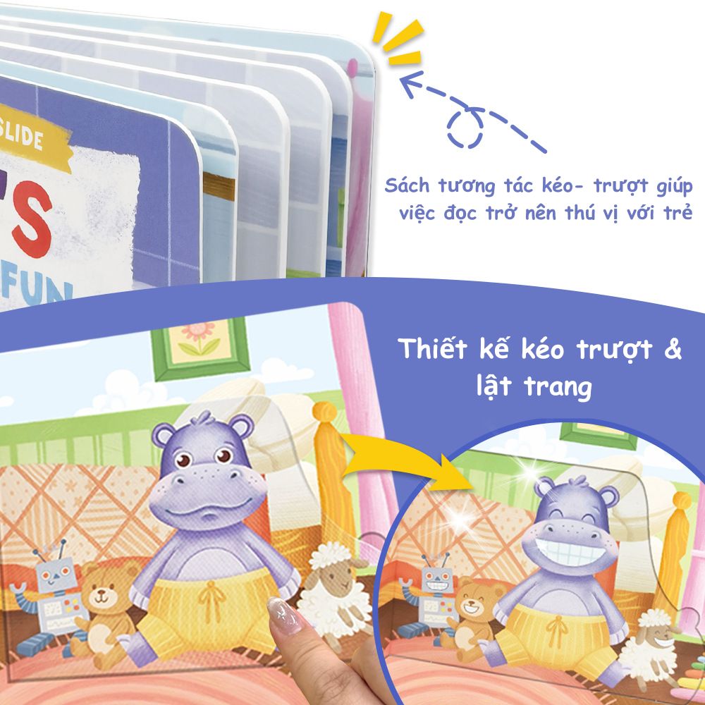 Kết hợp với thao tác tay (push – pull – slide, một số cuốn có touch & feel), bé tập trung hơn rất nhiều, đồng thời ghi nhớ hành động lâu hơn so với việc chỉ nghe nhắc bằng lời.