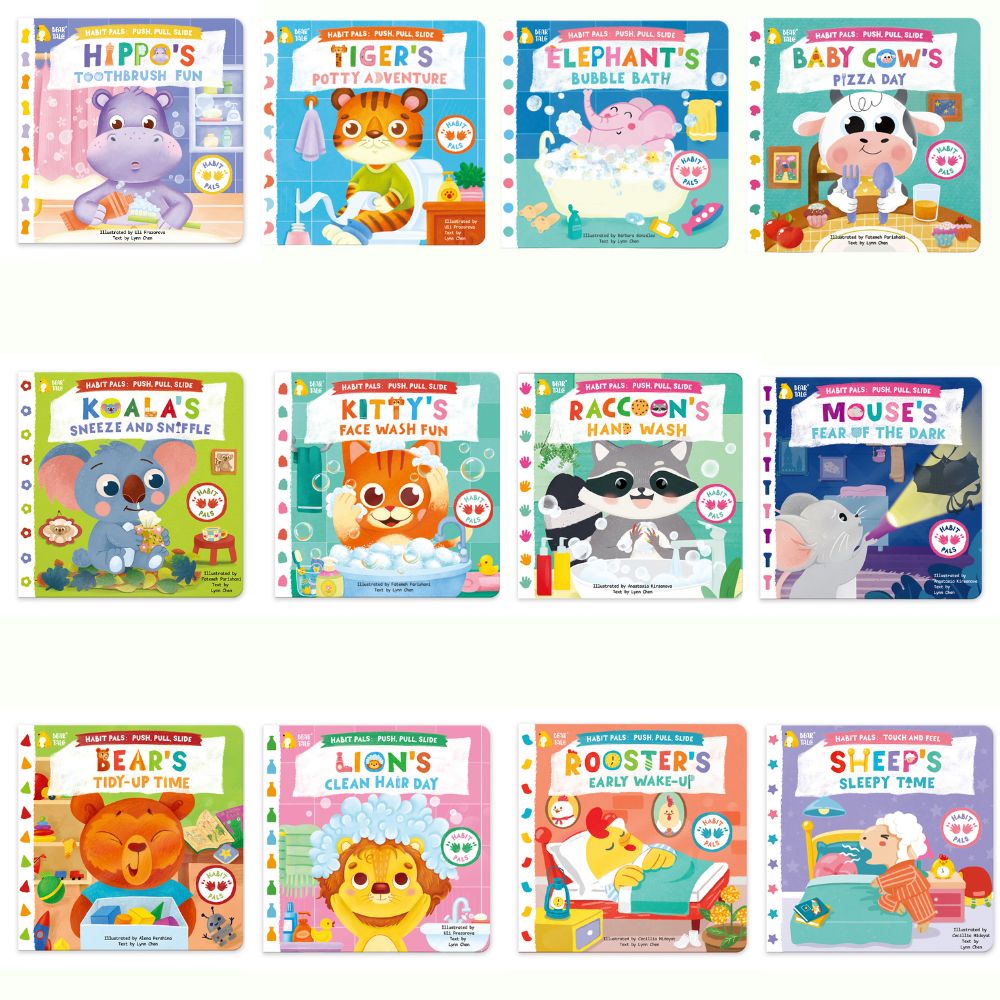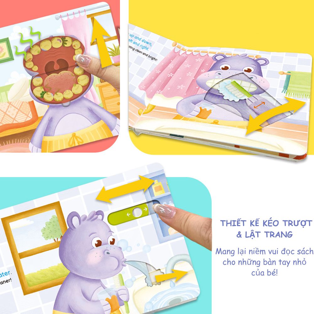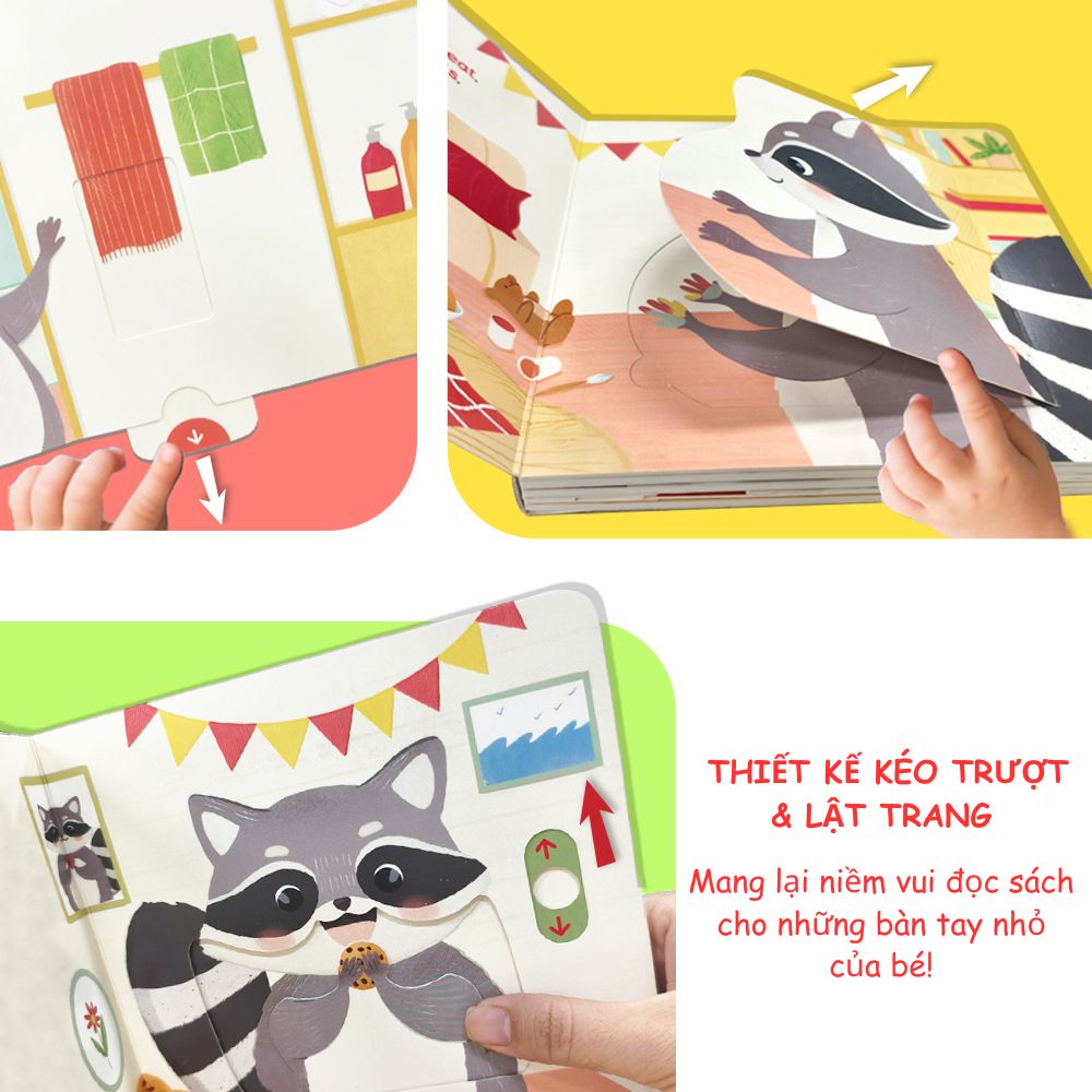 Đây là bộ sách tiếng Anh kỹ năng sống cho trẻ mầm non, kết hợp giữa câu chuyện ngắn – nhân vật thú cưng đáng yêu – sách tương tác kéo, đẩy, trượt, khiến bé cảm thấy mình đang chơi chứ không phải đang “được dạy”.