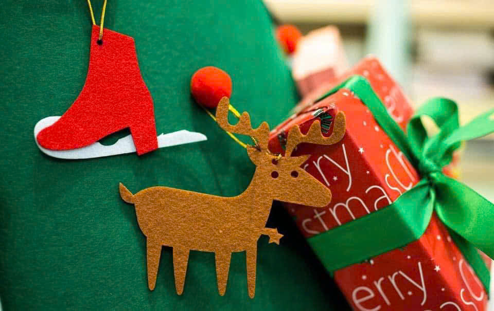 Ảnh: Chi tiết trang trí trên cây thông – Alt text: chi tiết trang trí tuần lộc và giày trượt băng bằng vải dạ trên cây thông vải dạ 3D Mideer