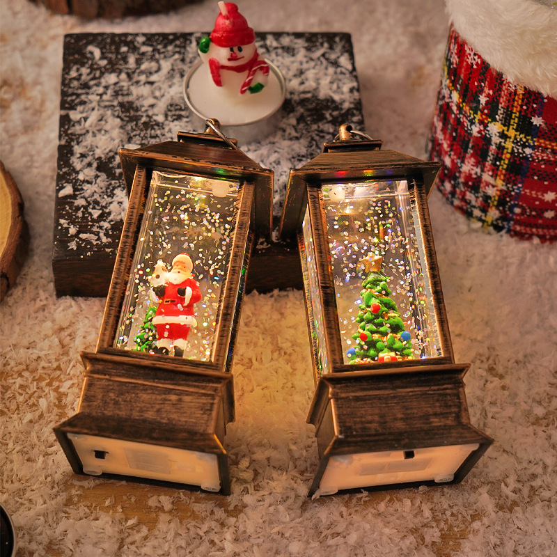 Đèn được thiết kế theo phong cách Vintage cổ điển với ánh sáng vàng dịu, bên trong là ông già Noel, người tuyết hoặc cây thông nhỏ xinh, cùng hiệu ứng tuyết bay lấp lánh khi bật đèn.