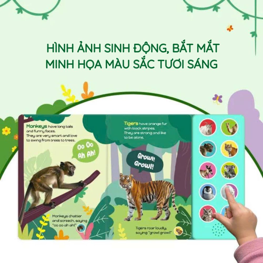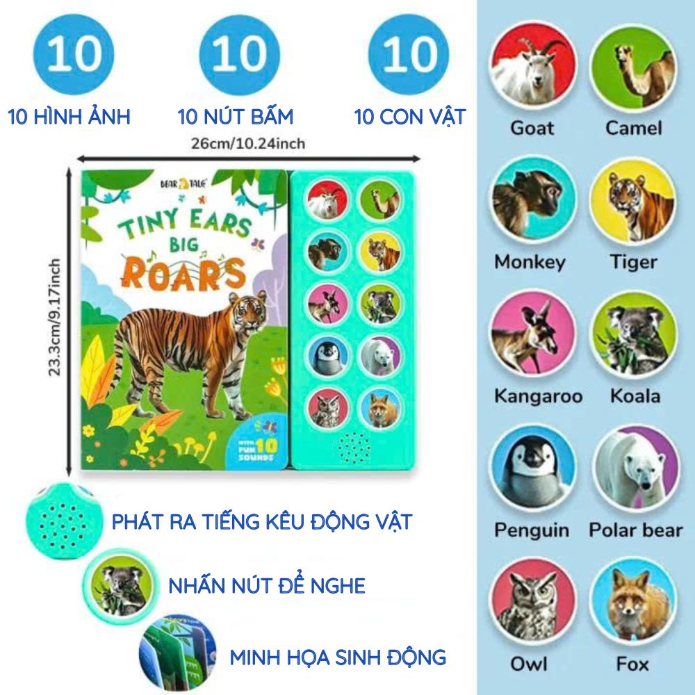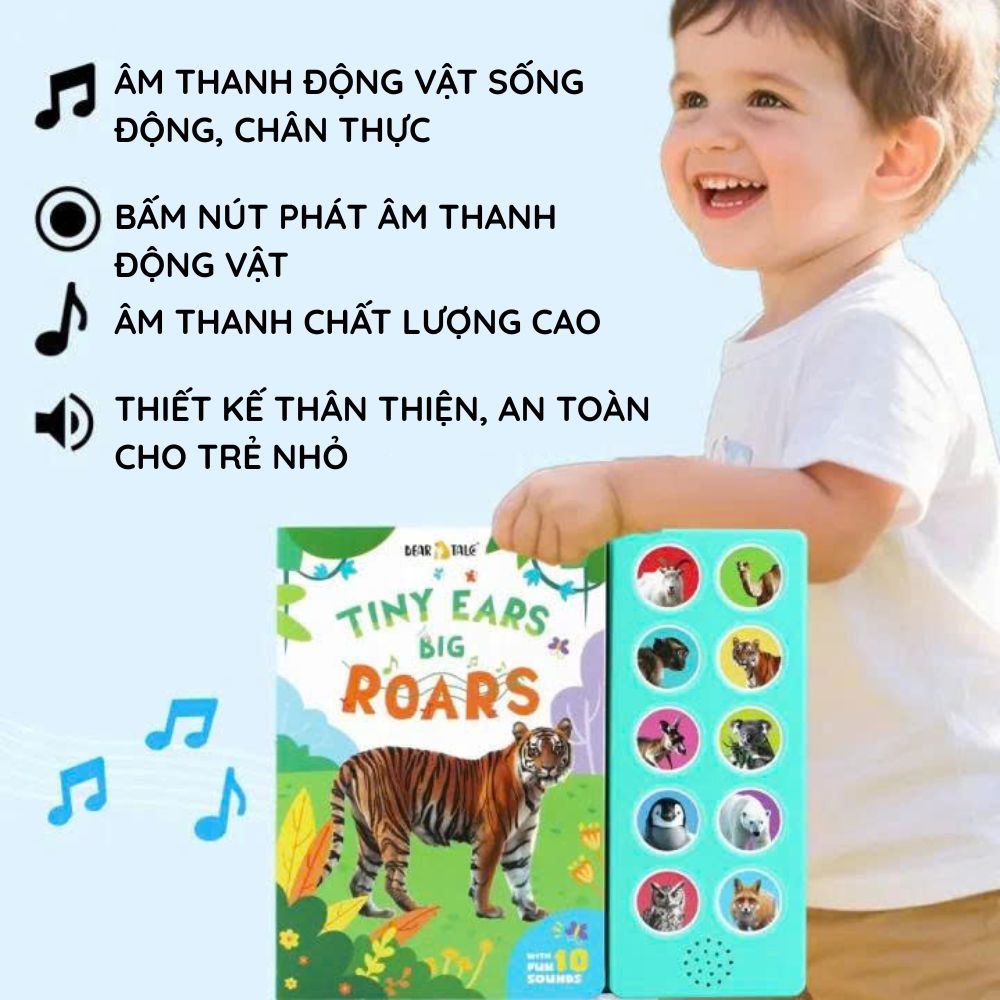 Tiny Ears Big Roars thuộc dòng sách âm thanh 10 nút, được thiết kế tối ưu cho trẻ từ 1,5–4 tuổi:
