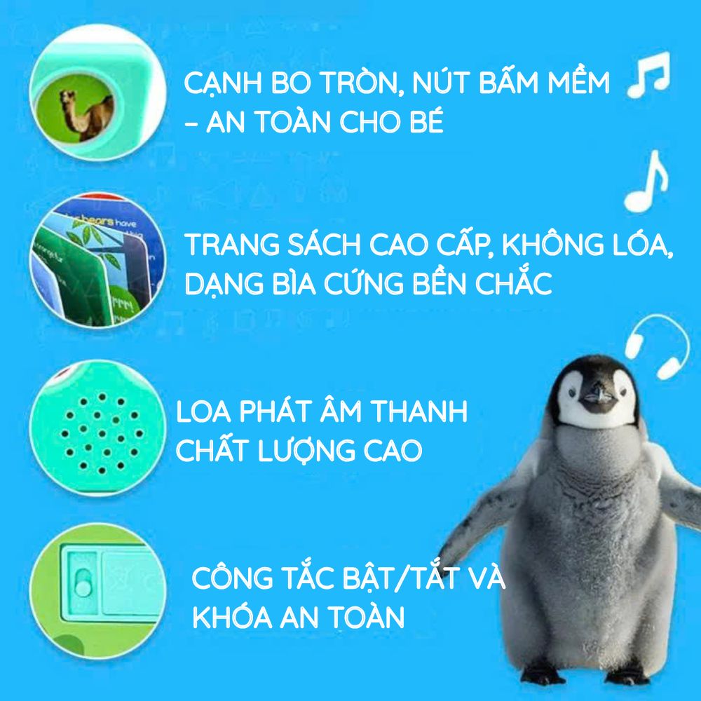 Bé vừa nhìn hình lớn, vừa nghe câu mô tả ngắn, sau đó tự tay bấm nút để nghe đúng tiếng kêu của con vật. Cách học này rất trực quan, giúp bé nhớ nhanh và chơi lặp lại nhiều lần mà không chán.