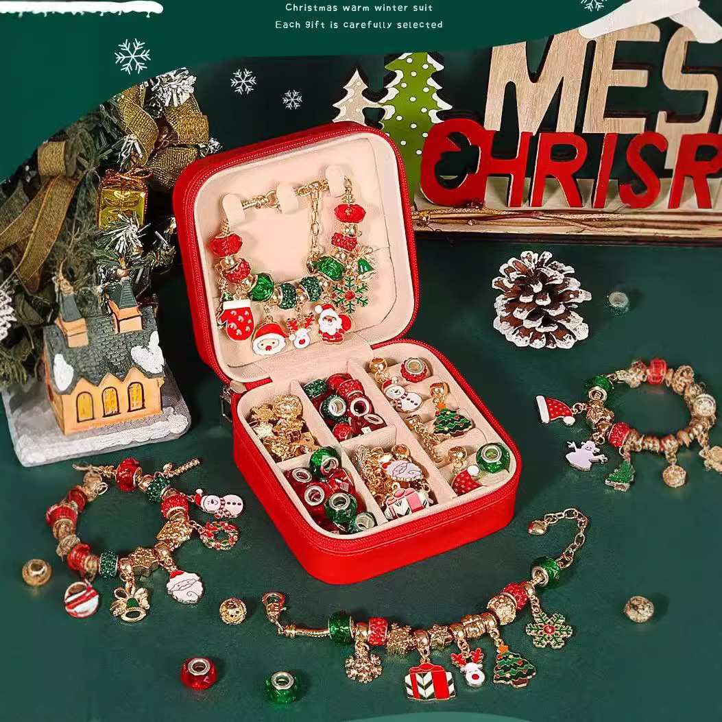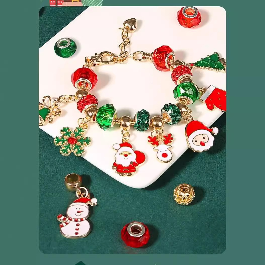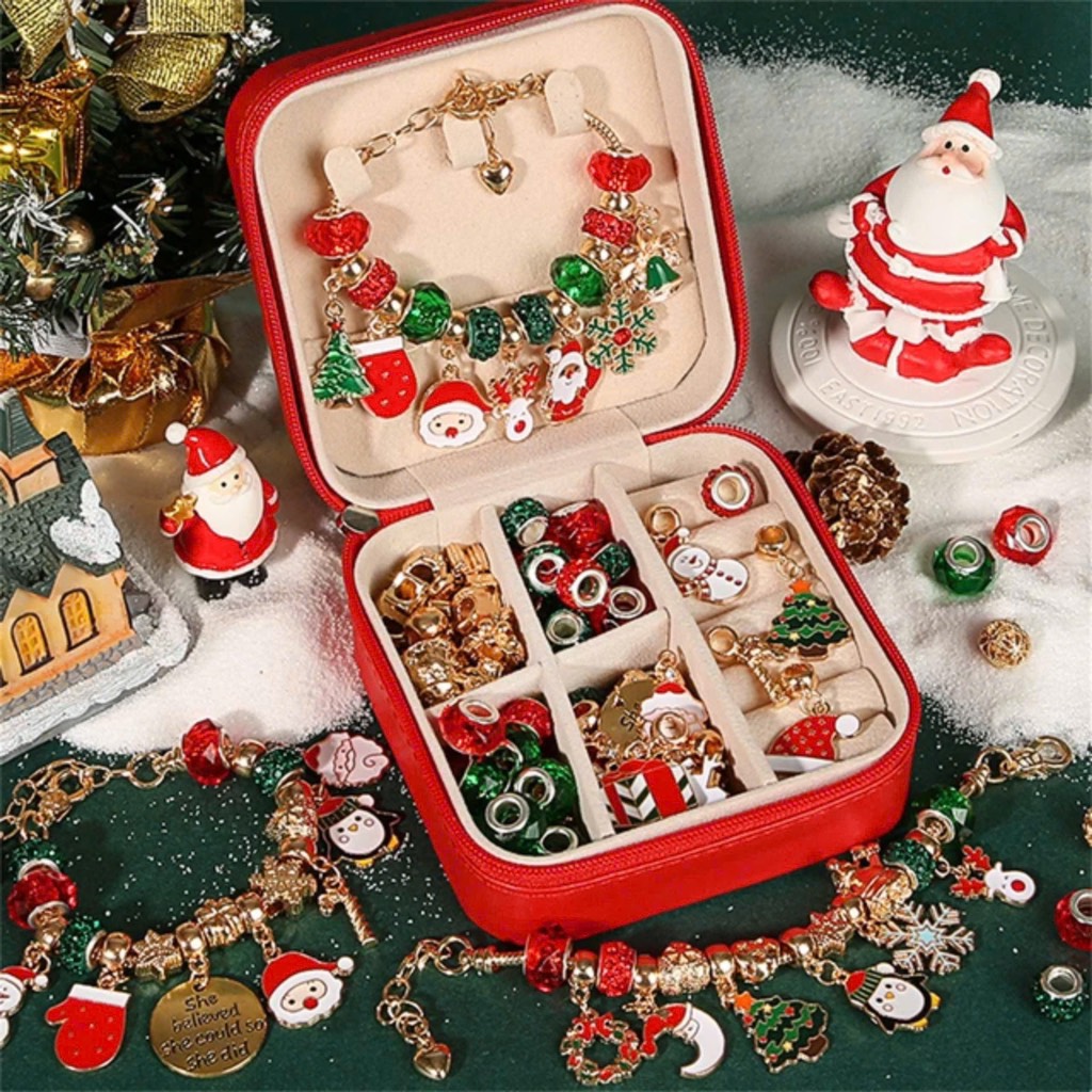 Một hộp nhỏ xinh thôi, nhưng mở ra là cả một thế giới Giáng Sinh rực rỡ với hàng chục charm nhỏ lấp lánh – ông già Noel, cây thông, người tuyết, tất đỏ, bông tuyết, chuông vàng… tất cả hòa lại tạo nên chiếc vòng tay ngọt ngào và đầy sắc màu lễ hội. ✨