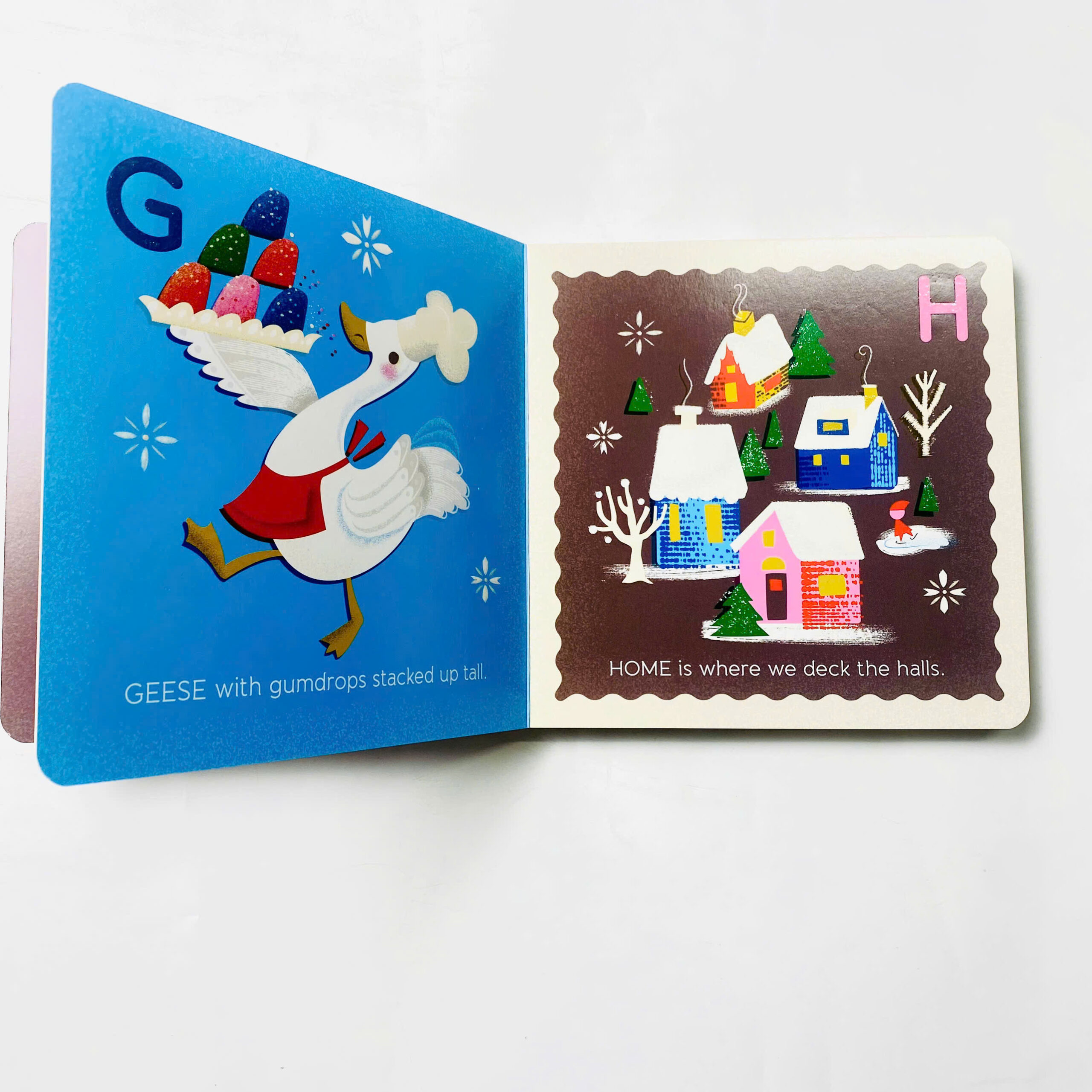 Điểm gây ấn tượng mạnh nhất của The ABCs of Christmas là hiệu ứng lấp lánh (glitter) nổi trên bìa và một số chi tiết bên trong. Khi bé nghiêng sách dưới ánh sáng, từng chữ cái và hình minh họa lại ánh lên vô cùng thu hút. Đây chính là yếu tố khiến trẻ nhỏ thích chạm – thích cầm – thích khám phá từng trang sách.