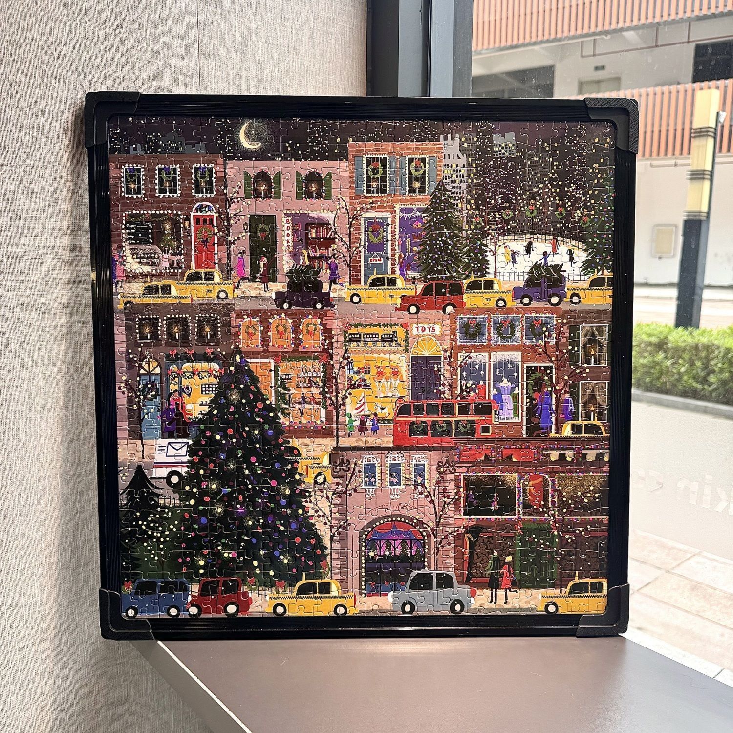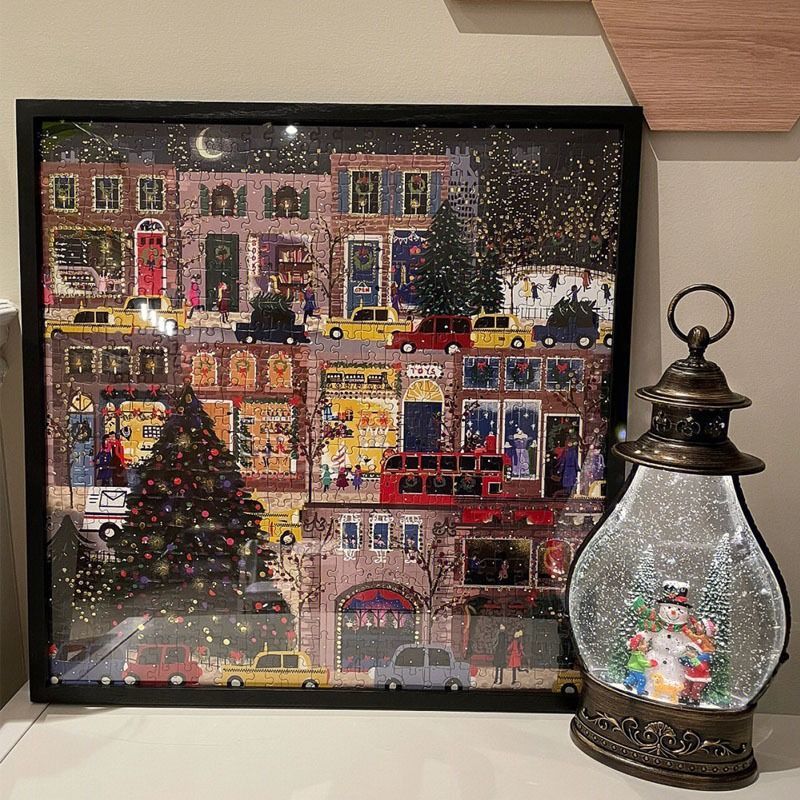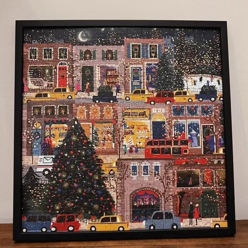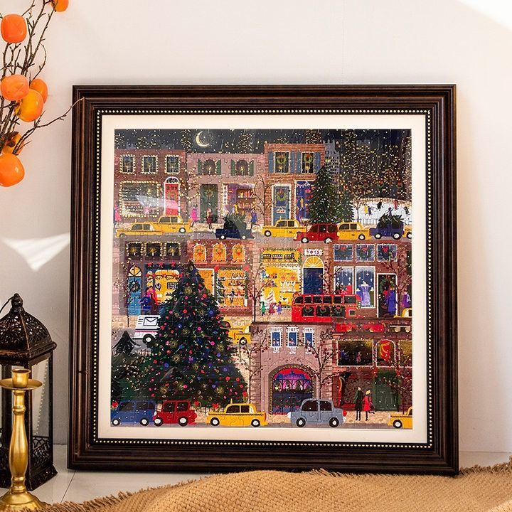 Bức tranh mô phỏng phố Noel nhộn nhịp, với ánh đèn rực rỡ, cây thông khổng lồ, cửa hàng đồ chơi, xe buýt đỏ và những người đang tản bộ trong tuyết. Mỗi mảnh ghép là một phần nhỏ của không khí Giáng Sinh ấm áp và hạnh phúc.
